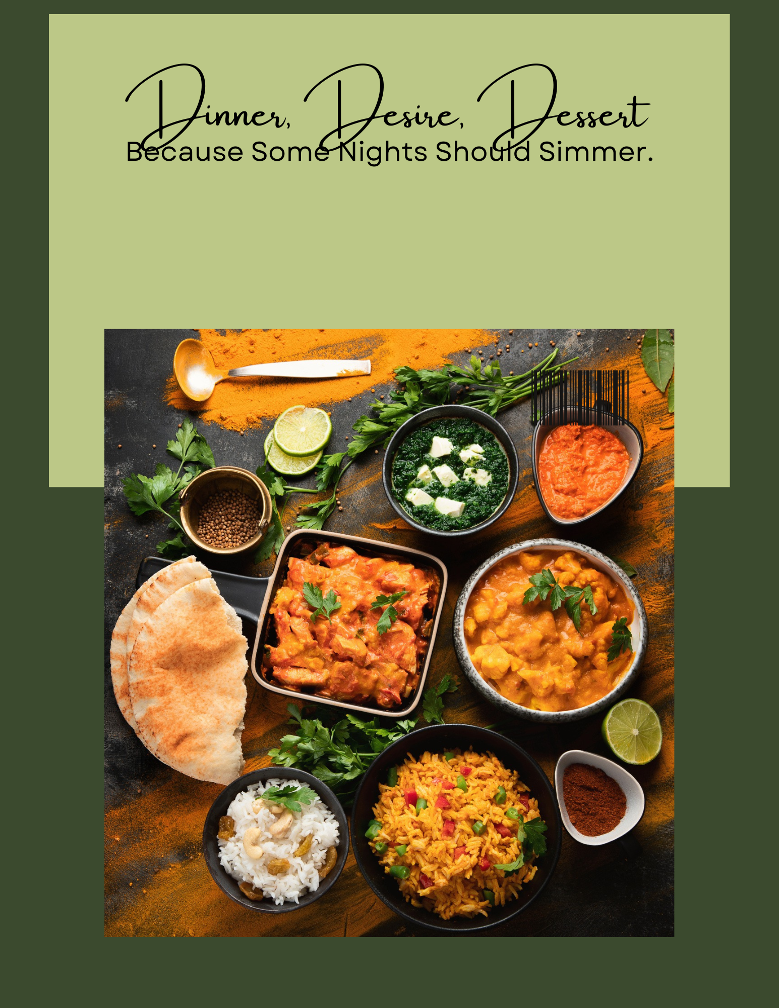 Indulge in a little dinner, a lot of desire, and the sweetest dessert. This easy-to-follow guide, "Dinner. Desire. Dessert", is packed with cheeky tips, creative ideas, and plenty of flavor to help you create magic faster than you can say, ‘Pass the wine!’"